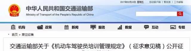 2.登陸交通運(yùn)輸部網(wǎng)站(網(wǎng)址:http://www.mot.gov.cn),進(jìn)入首頁右側(cè)的“意見征集”點(diǎn)擊“關(guān)于《機(jī)動車駕駛員培訓(xùn)管理規(guī)定》(征求意見稿)公開征求意見的通知”提出意見。