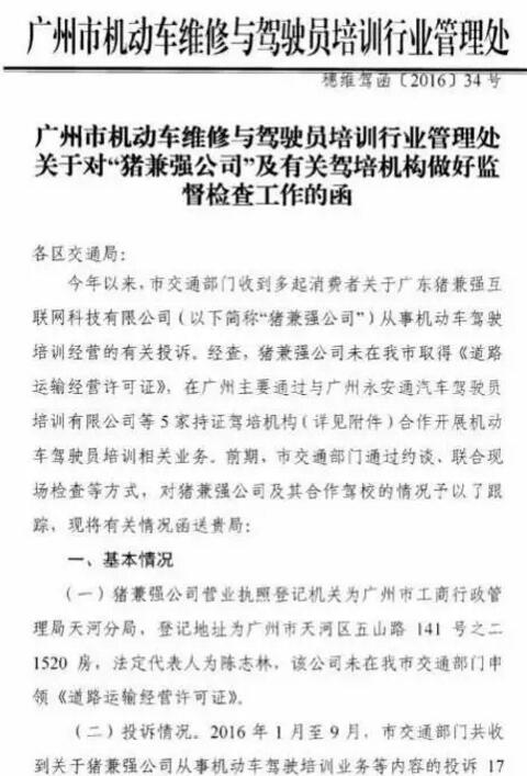 2019年10月廣州市機動車維修與駕駛員培訓(xùn)管理處簽發(fā)《關(guān)于對“豬兼強公司”及有關(guān)駕培機構(gòu)做好監(jiān)督檢查工作的函》標志著“互聯(lián)網(wǎng)+陪練公司“被納入運管部門的監(jiān)管。